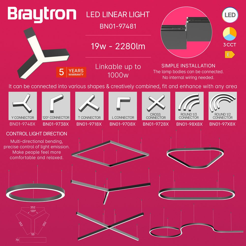 Konektor Y za linearnu svjetiljku 19W 3CCT 2280lm 390x340mm IP20 crna ALINE BRAYTRON BN01-97481