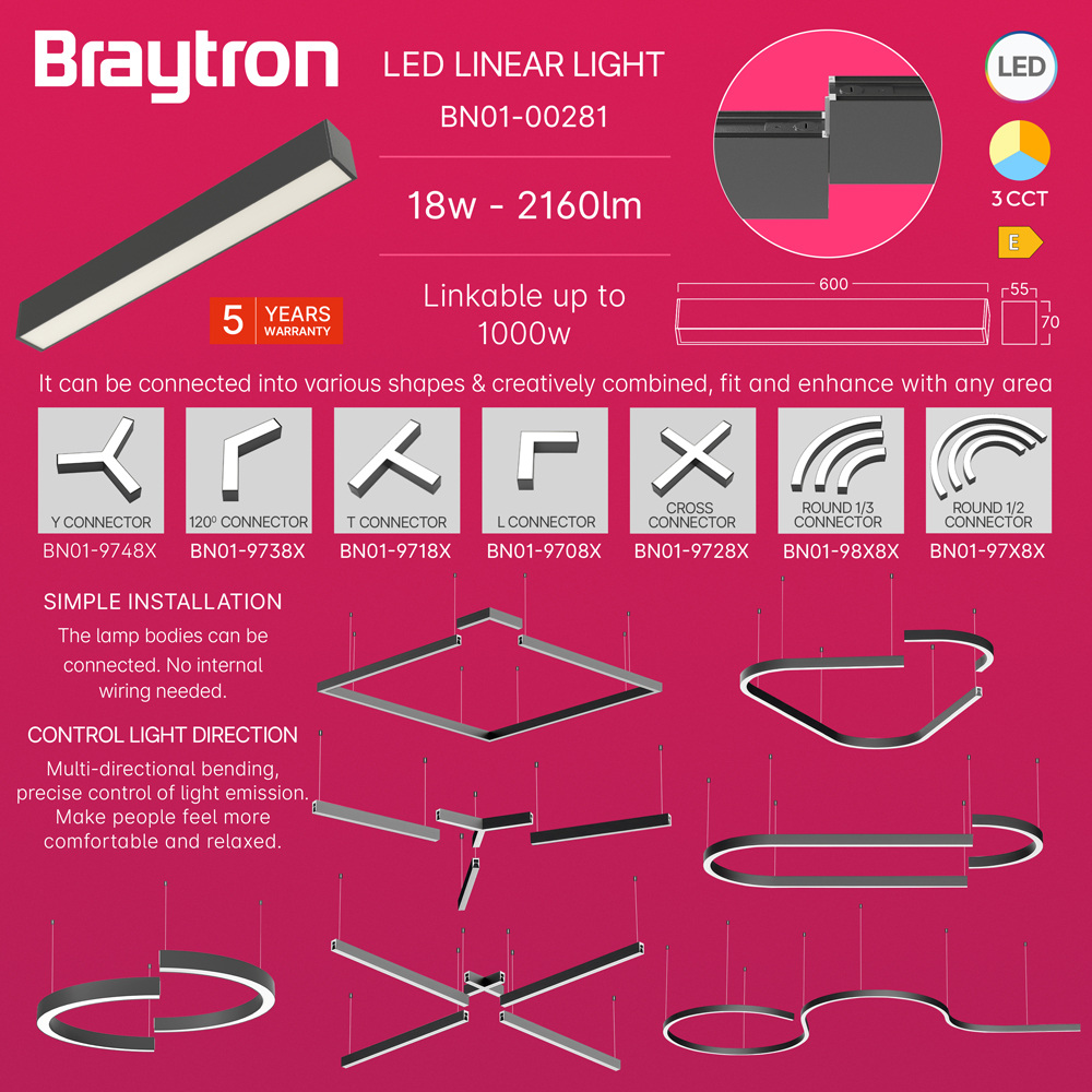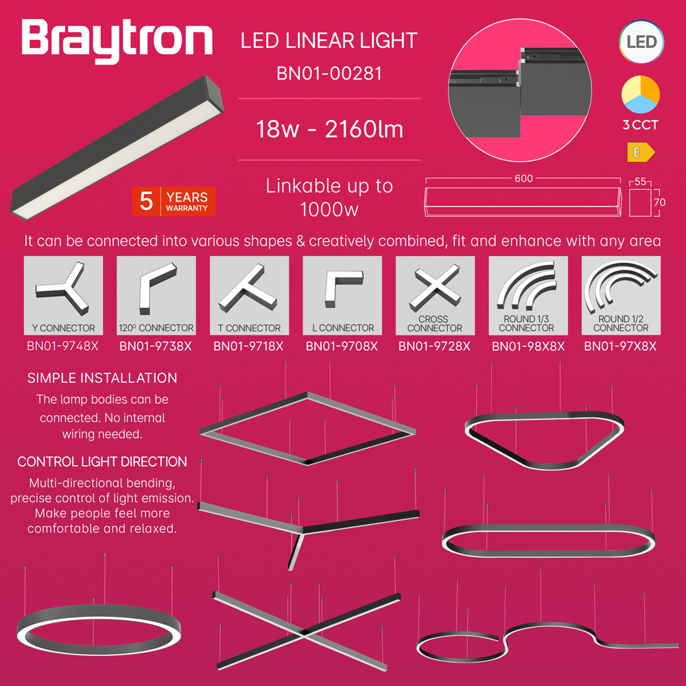Linearna svjetiljka 18W 3CCT 2160lm 600mm IP20 crna ALINE BRAYTRON BN01-00281