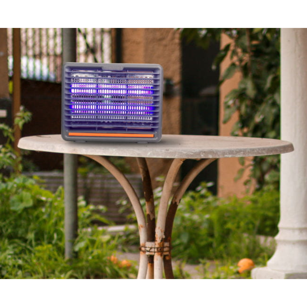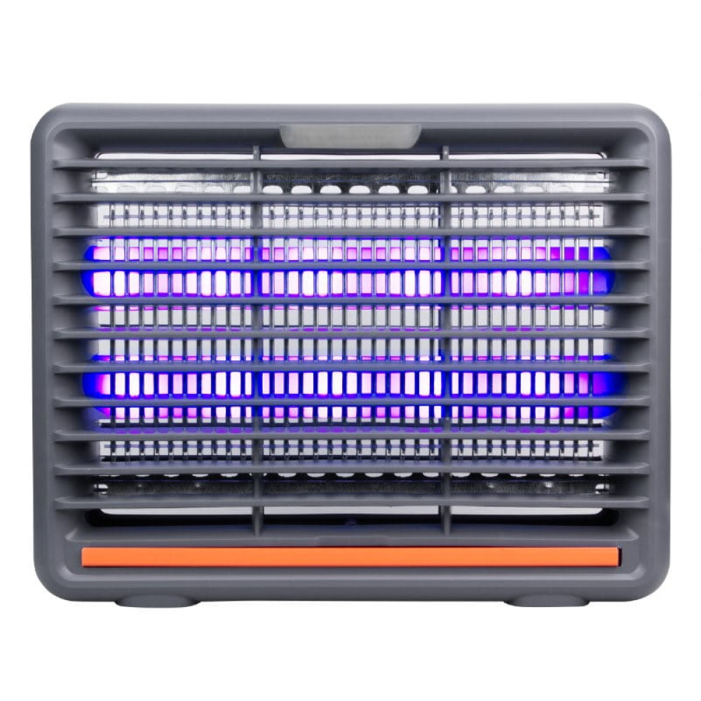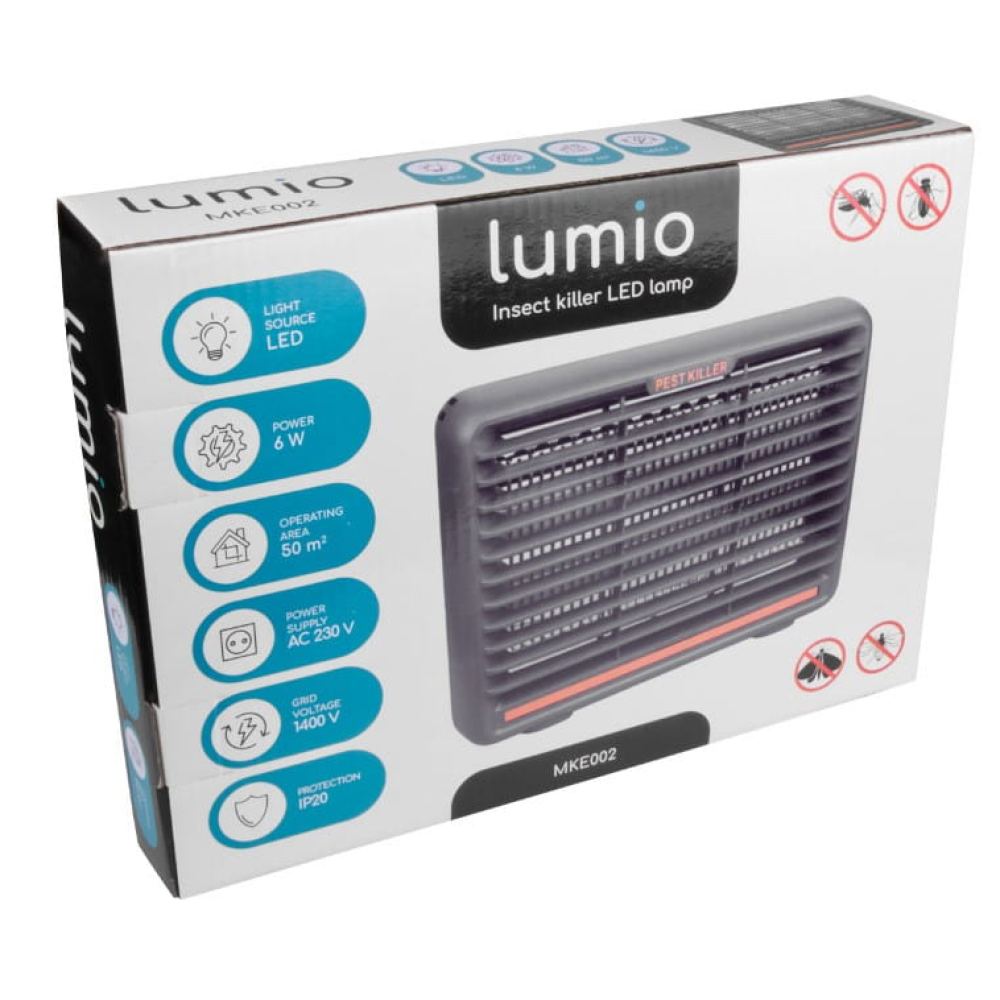 LED svjetiljka za ubijanje insekata. Napajanje: 6 V. Ulazni napon: AC 230 V~. Napon mreže: 1400 V. Područje djelovanja: 50 m2. IP20. Uklonjiva posuda za insekte. Boja: siva. Pakiranje: kutija u boji
